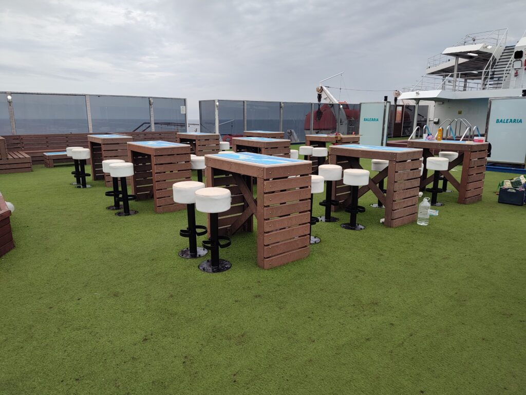 Mobiliario exterior para terrazas de barcos de Balearia fabricado con plástico reciclado de basura marina, taburetes, sillas, mesas altas y sillones. Material con resistencia a cualquier clima